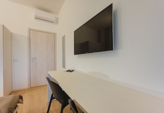 Das Zimmer verfügt über ein Doppelbett, Smart-TV, Schreibtisch, individuelle Klimatisierung warm/kalt und thermoakustisch isolierte Fenster.