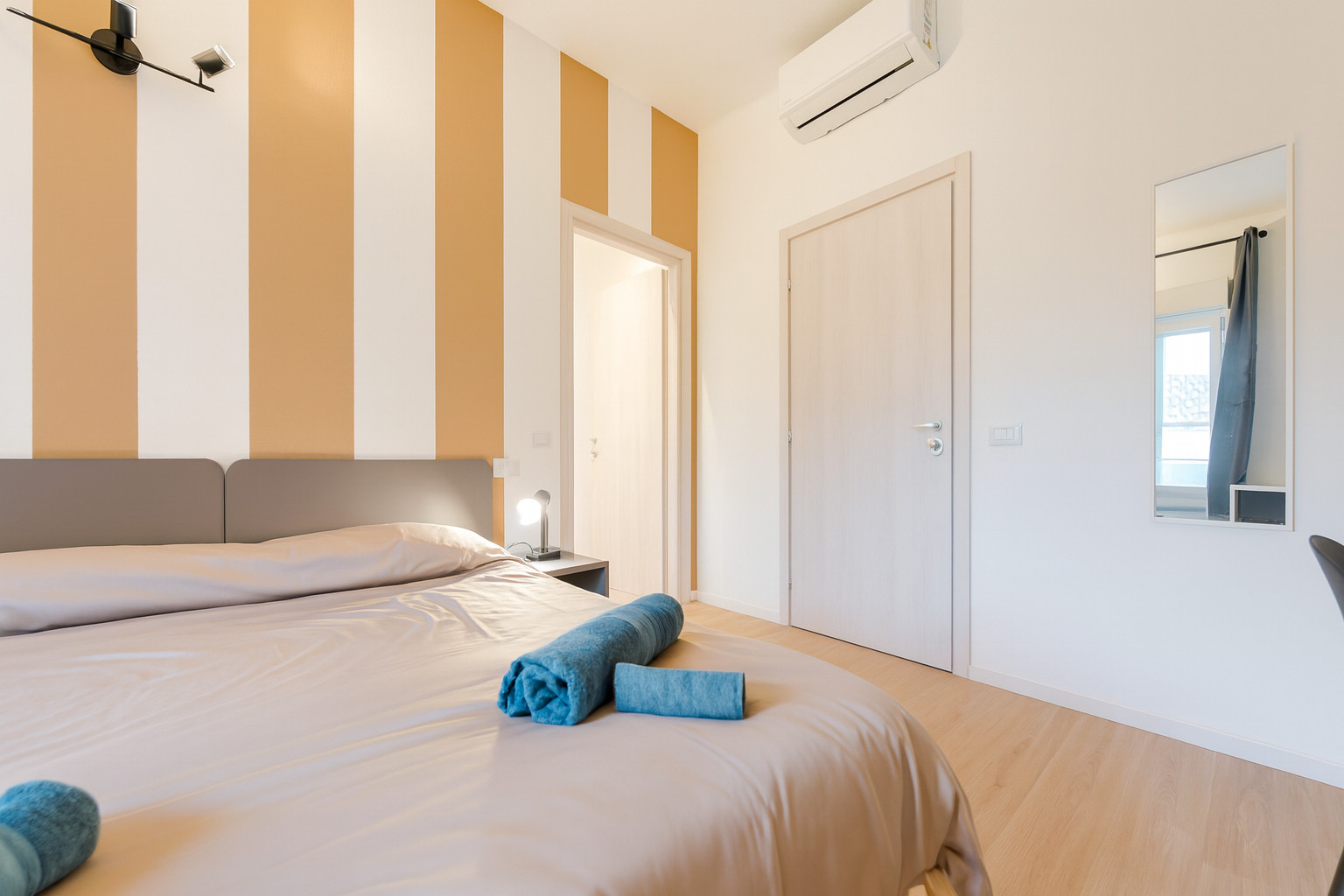 The room features a double bed, Smart TV, desk, independent heating and cooling, and thermo-acoustic insulated windows.