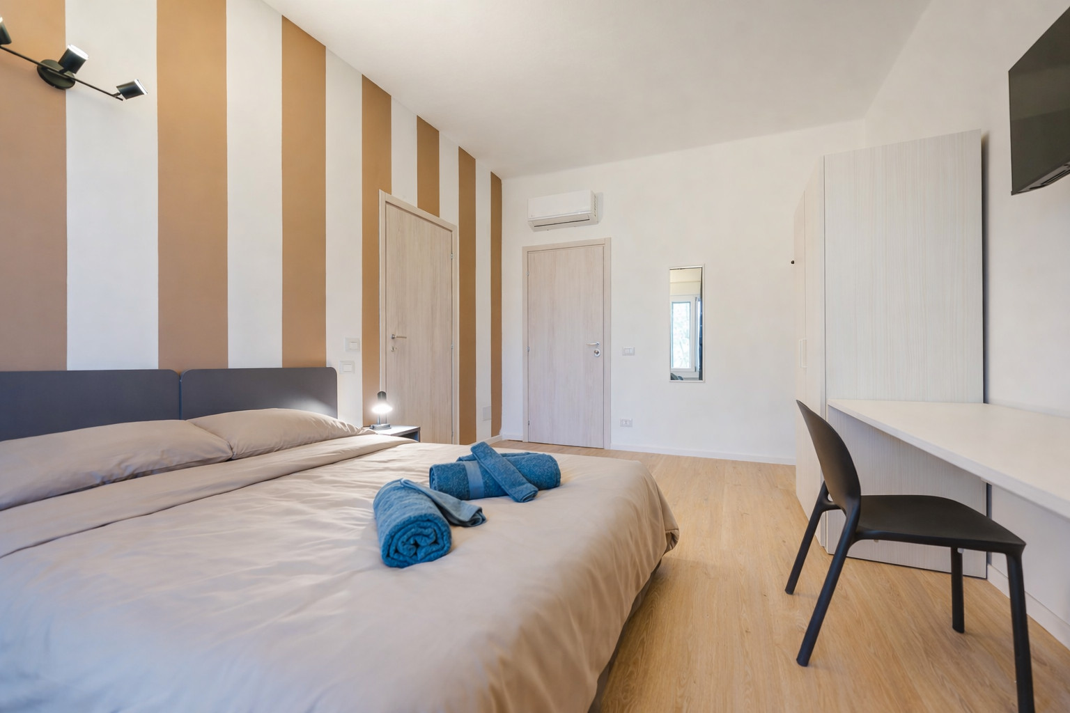 La habitación cuenta con cama doble, Smart TV, escritorio, climatización independiente frío/calor y ventanas con aislamiento termoacústico.