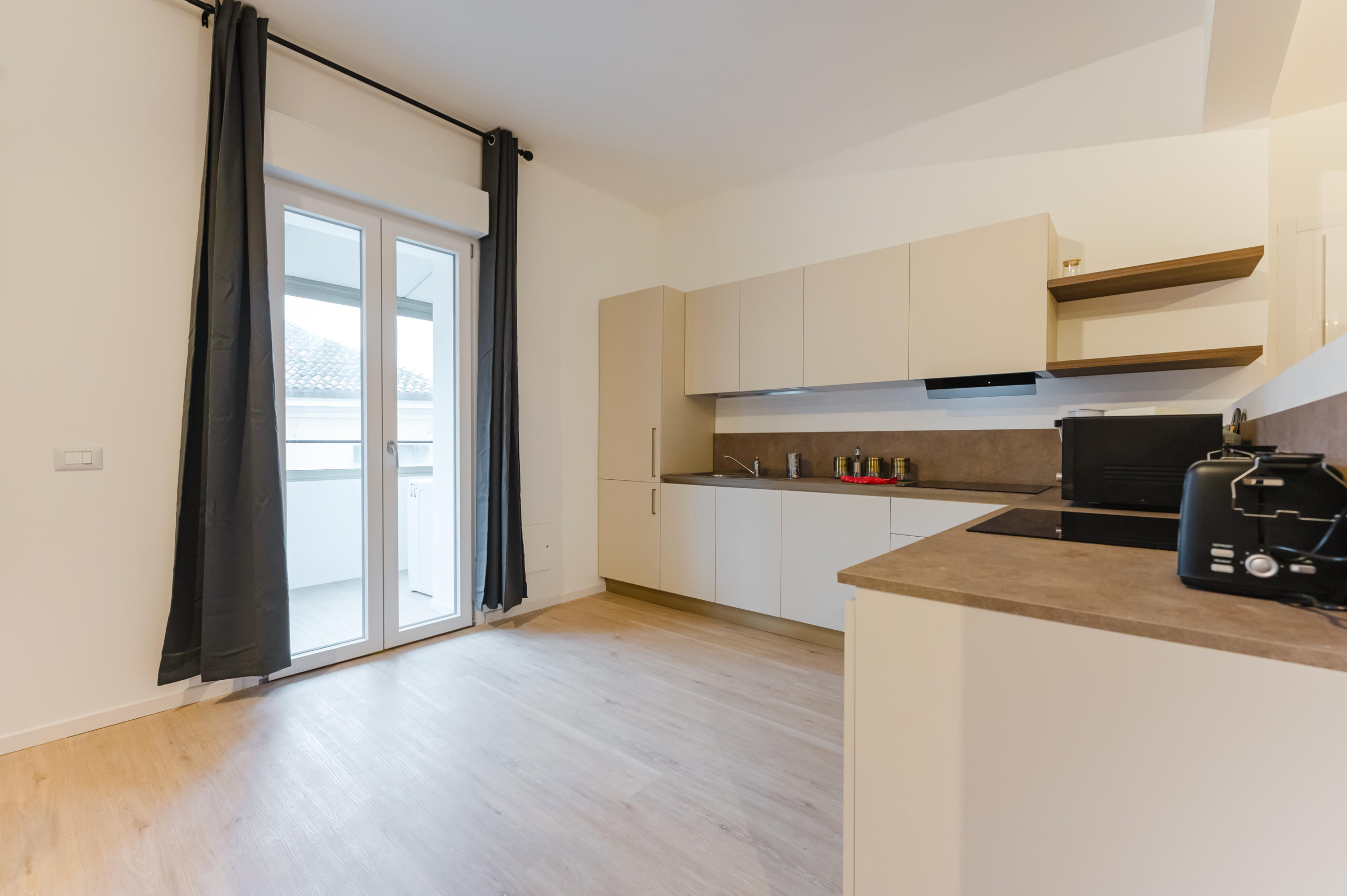 Four, micro-ondes, plaque de cuisson, vaisselle, ustensiles et machine Lavazza.